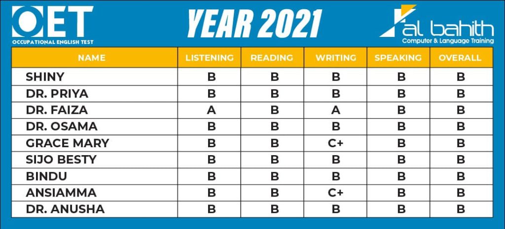 Al Bahith provides training for nurses, doctors and pharmacists to crack the OET examination. Ms Manju, the Head of Training, personally takes OET classes according to the duty timings of the student. Classes are conducted 3 days per week for 2 hours in which first hour is theory, and the second hour is practice.